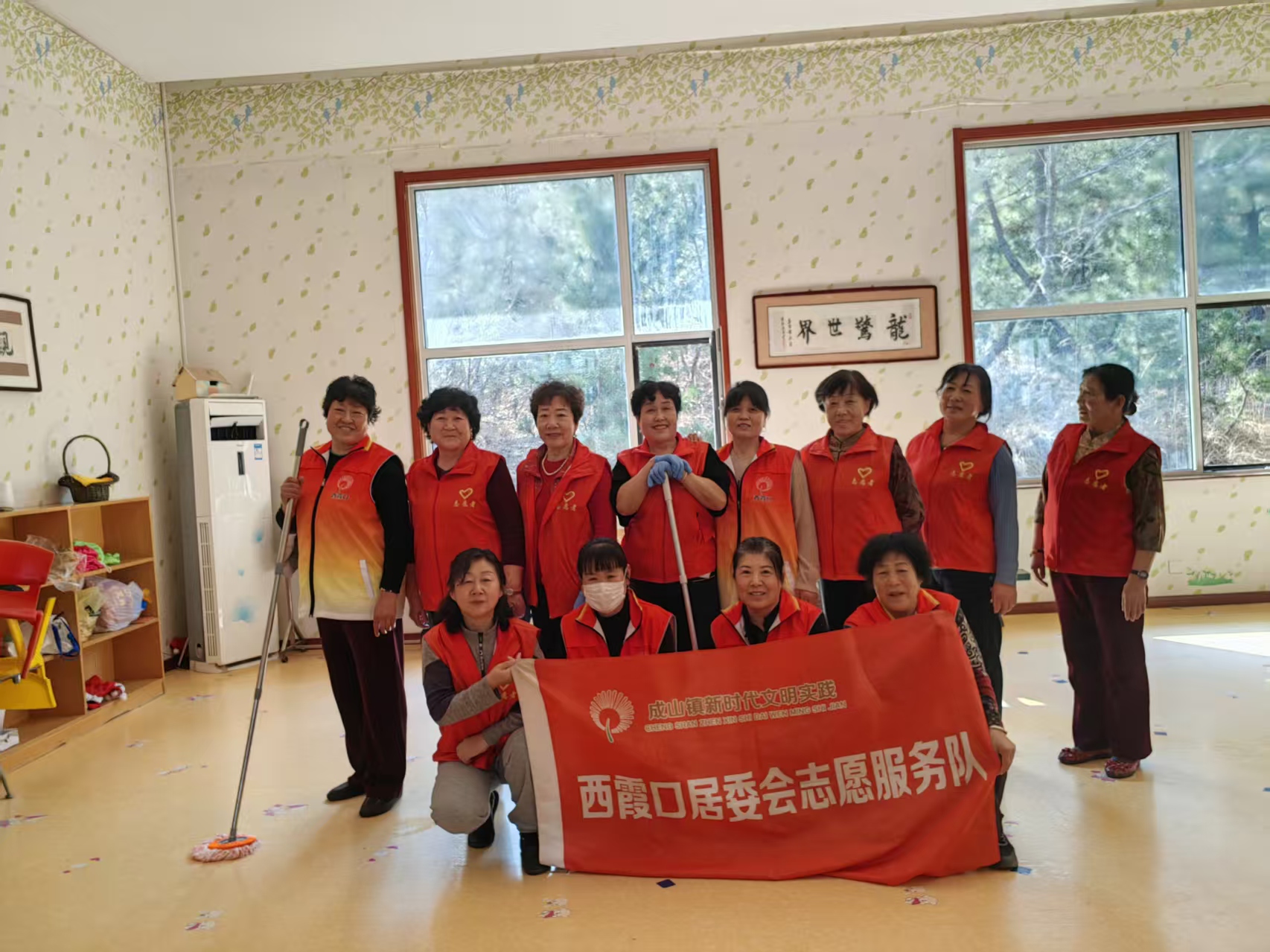 成山镇西霞口社区志愿服务队3月24日组织志愿者开展社区舞蹈室卫生清理志愿服务活动