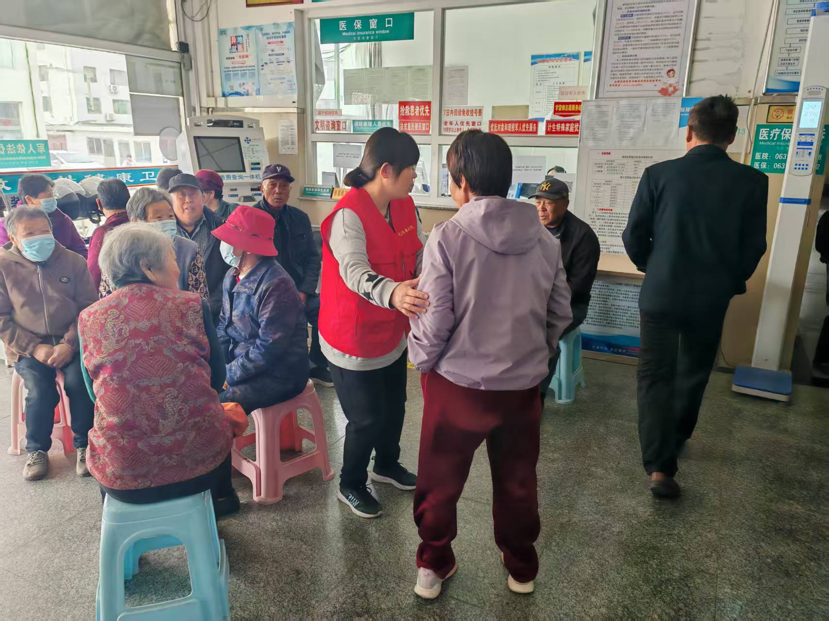 荣成市东城区社区卫生服务中心志愿队4月21日开展健康查体现场维持秩序、引导志愿活动